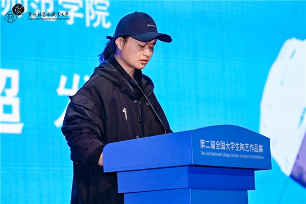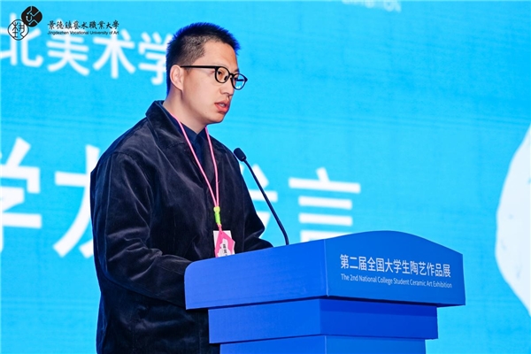 入围学生代表重庆第二师范学院石仪超分享了其算法类作品《凝聚虚空》的创作理念。他谈到,将传统陶艺与数字技术结合,是新一代创作者对陶瓷语言的当代诠释,并呼吁广大创作者勇敢跨界,让古老技艺在青春手中焕发新生。