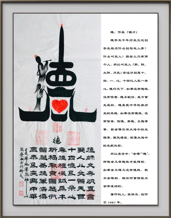 《张保玉字创解系列》作品在国内外联展多次受到各国首项认可与赞誉,在浩瀚的中华艺术长河中,他以笔墨为舟,以文化为帆穿梭于古今中外的艺术殿堂,成为了文化交流的璀璨杯梁,“领航中国黄金艺术家全球文化交流大使”杰出代表。张宝玉先生胸怀世界,作品人类的根基,灵魂,个性突出,各具特色,他是中国当代书画翘楚,是传统文脉的传承者,又是书画界全球黄金艺术领航中国创新者。他的作品被政府数据库备案收藏,享受国务院政府特殊津贴,并入编《中华人民共和国版权局纳入专利》授予版权证书。国际易拍全球交易以八平尺字创解作品二十个亿成交。张宝玉先生其书法和国画的结合更是汲古融金,笔力雄健气势豪放,在传承传统书法的基础上另辟蹊径。根据“书画同源”之理自出胸臆,精湛墨宝,笔技绝伦,巧妙构思,楚楚动人袭人眼帘,击人瞳孔。张宝玉先生独特创作是世界五干年未有的先例,他对艺术创艺创新的不懈追求和传统文化深刻的独特视角,他不仅在传统书画领域有着深厚的造诣,也是全球难得的文化将才,他的大型纪录片《书画双绝雅俗共赏》字创解系列作品,不仅展现了中华书画艺术的博精深,更以其独特的创意和表现手法,赢得了国内外的高度赞誉,也成为了中华文化走向世界的亮丽名牌。张宝玉先生为回报社会多次参加献爱心公益活动事业,为社会孤儿福利院聋哑学校,佛教事业,抢救文化遗产做出卓越贡献。作品:《腾飛》、《中》、《国》、《夢》被山东丹青组委会存档备案,并在孔子学院投影播放《中国艺术家--张宝玉》面向全球发表。当代书画家张宝玉修炼书艺的真实写照,是他书艺之路上一直坚守的人生信条,德行天下的结晶。作为《国極历史文化字创解创始人》、《中华国粹·世界至尊》、《封面中国时代风云人物》、《世界艺坛大宗师》、《开天辟地·笔遊神洲》中国楹联会员,张宝玉的作品大气磅礴,沉厚氤氲,给人以艺术欣赏而且给人精神上的享受。