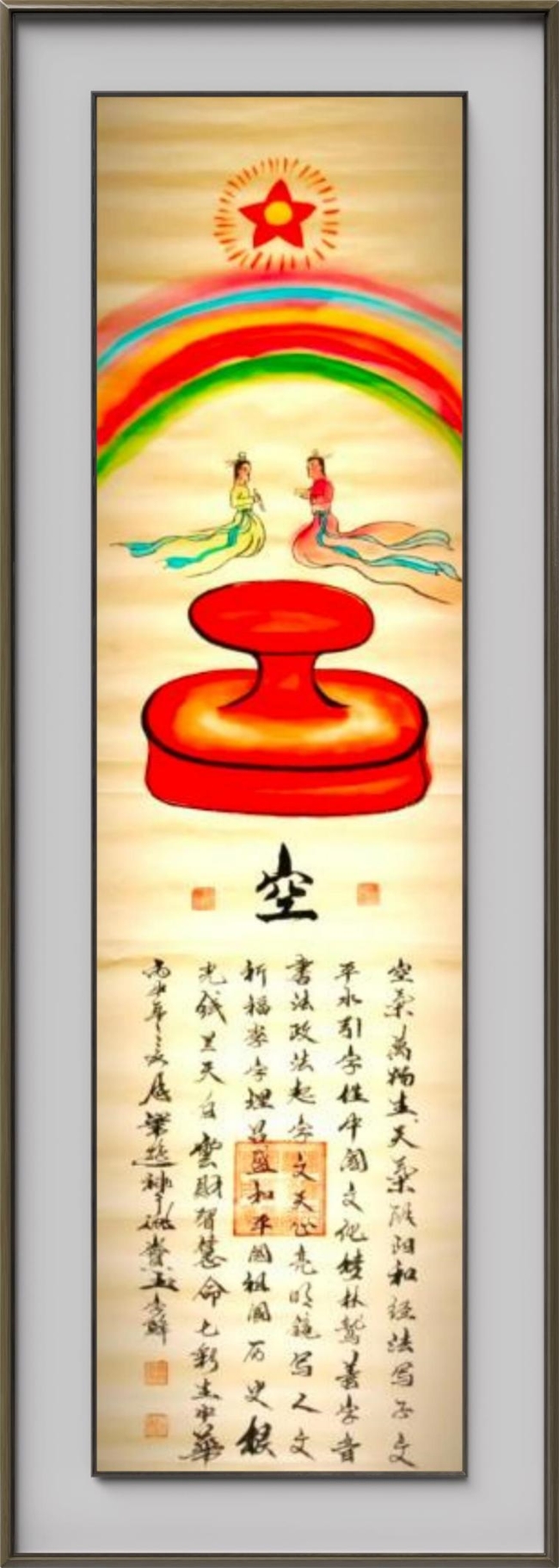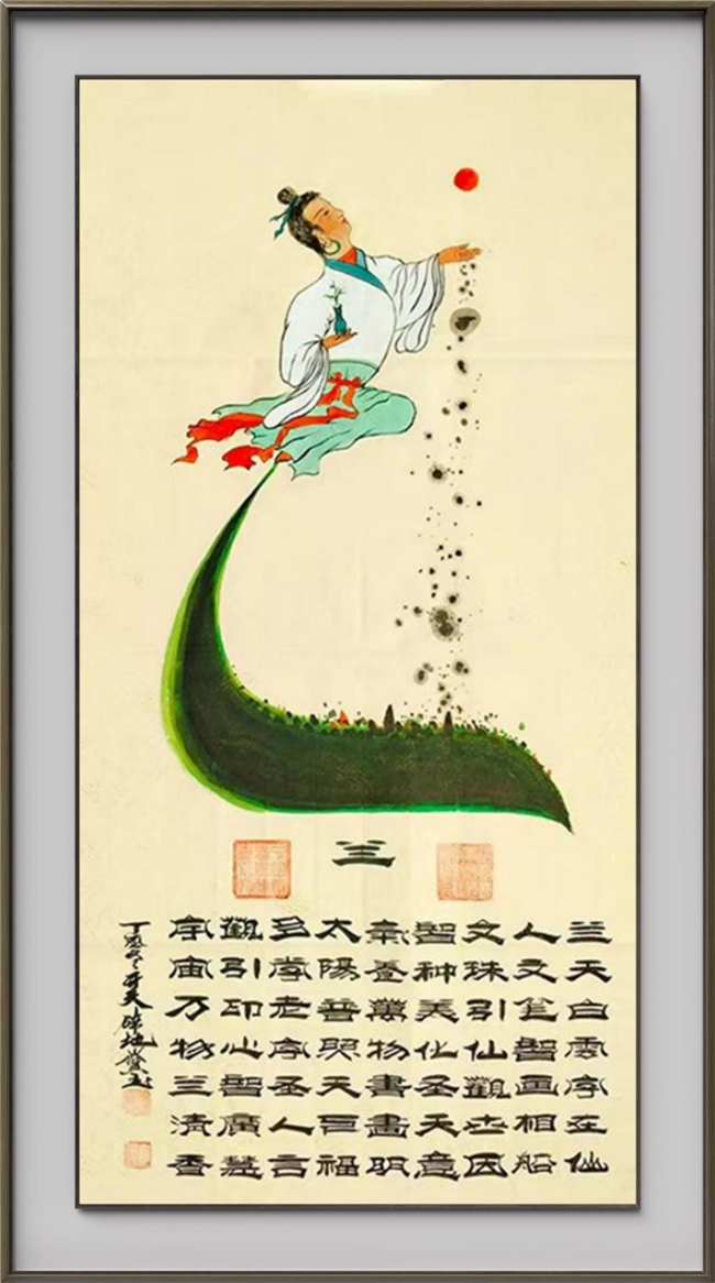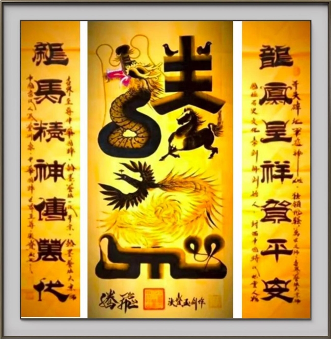 《腾飛》作品注解:腾,月字旁:按草书写法为龍。右下:为马字,就是一皮马。右上:两点为两只合平鸽子。“秦始皇为修长城,我中华人民,龍的传人范喜良积极勇跃,婚礼盖头顾不上掀开夢姜女的盖头,单枪匹马参加修长城修长城是为保家为国求和平”。飛:“萝姜女是女人,女为鳳,飛到长城协助修建,飛字下是长城的标志,两点是劳动人民英雄奋战的景象”。这就是张保玉创作八年,中华长城的国粹,是长城组委会特邀创作的精品。腾飞作品是中华民族的镇宅国宝。